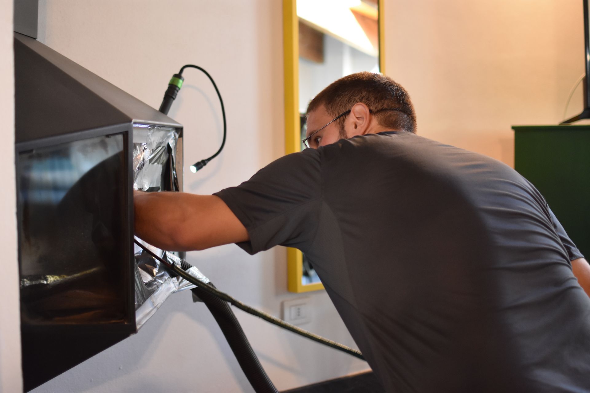 Dopo una prima verifica ed ispezione dell'impianto, si procede con la sigillatura dello stesso, in modo da non lasciare residui / sporcare nulla durante la fase di manutenzione. Sigillato l'impianto, e verificata la corretta tenuta, si mette sotto pressione l'impianto tramite un'aspiratore industriale (quello che garantisce il lavoro pulito). Si procede poi con la fase di raschiatura della canna fumaria.